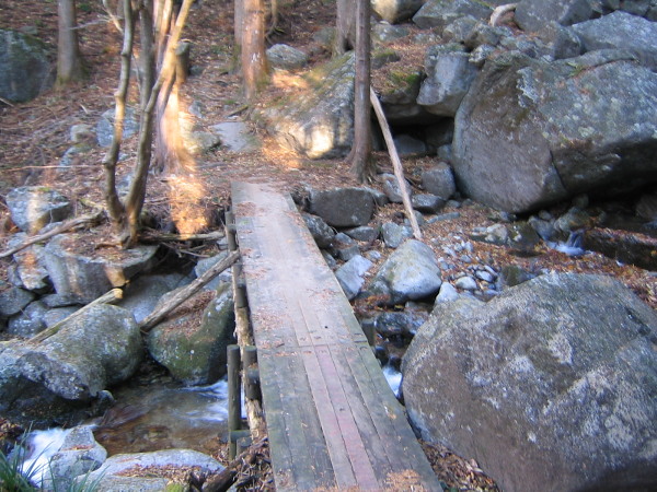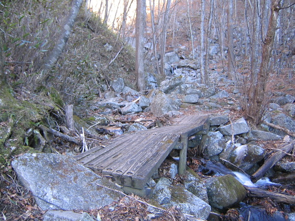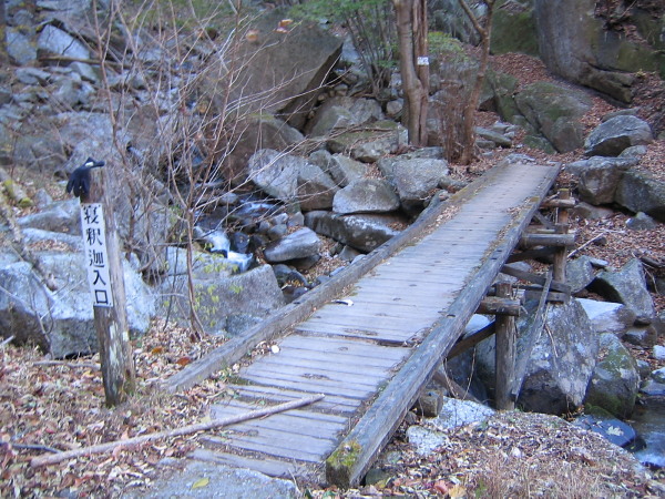 寝釈迦入口が登山口。この橋を渡ると山道になります。
