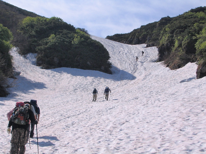 8:28 大雪渓を登りきった場所から。羅臼平はもうすぐです。