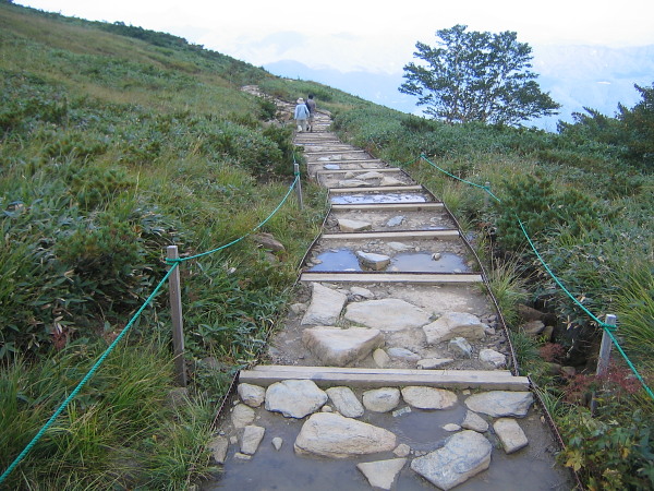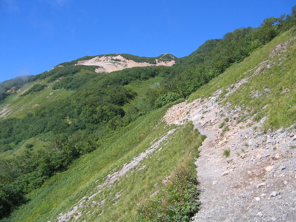 10:01 八方池を過ぎて樹林帯を少し歩くと斜面を横切るように道がついています。