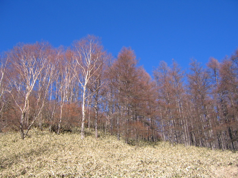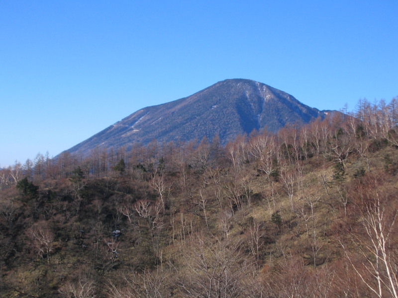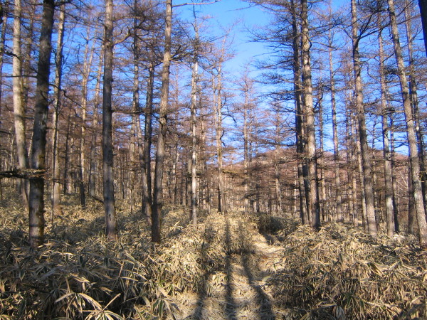 8:26 落葉松林を抜けると男体山がまた見えます。