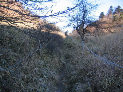 それなりの登りが終わり、平らな道になるとロープが現れます。