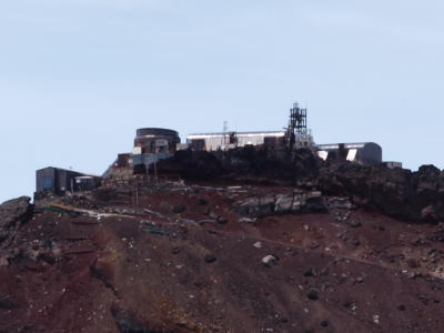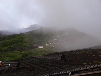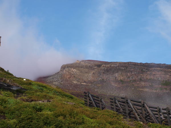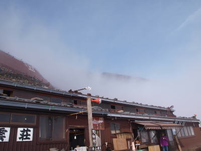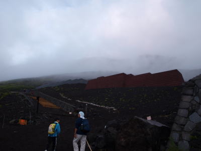 6:00 ガスが流れて七号目の山小屋が見えてきました。