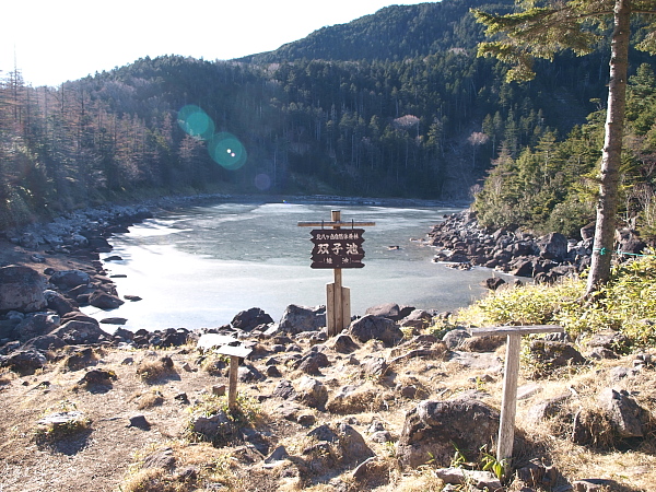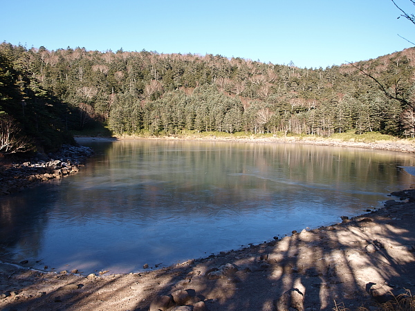 双子池(雌池)の全景。全体に薄氷が張っていました。