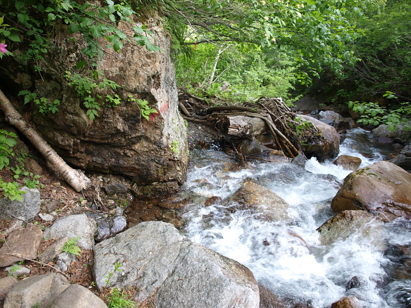 二岐沢・二ノ沢出合からは沢歩き(登り)が暫く続きます。でも沢オンリーではありません。