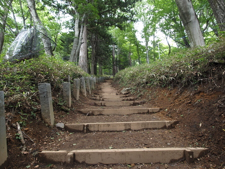 森の中を黙々と登ると石垣が見え、三合目が近いです。
