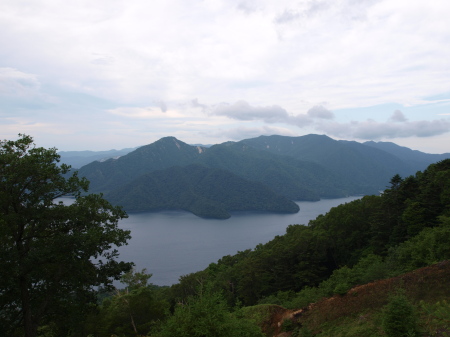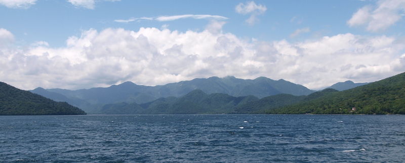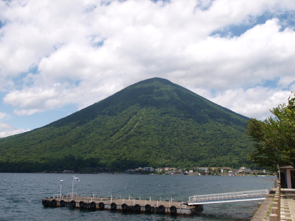 中禅寺湖からの男体山。山頂部分だけ微妙に雲がかかっています。