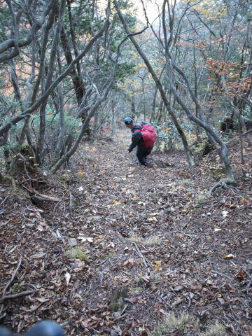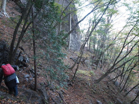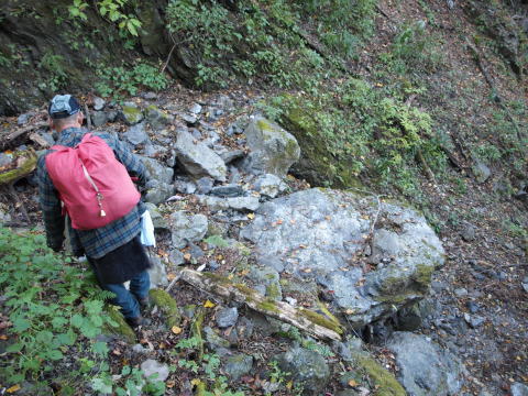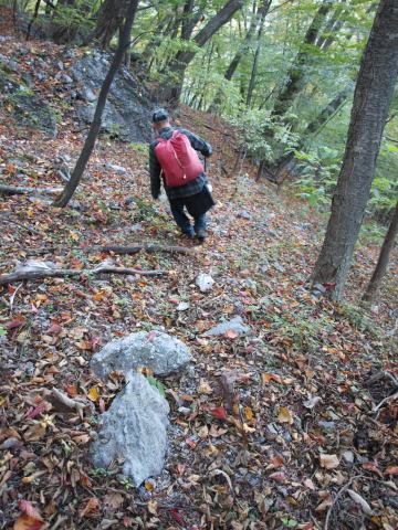 14:32 地獄穴を過ぎると岩屑と落ち葉の道。歩きづらい・・・