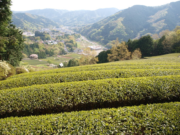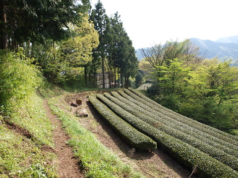 15:09 茶畑がきれいです。集落が見えたら15〜20分位でバス停に着きます。