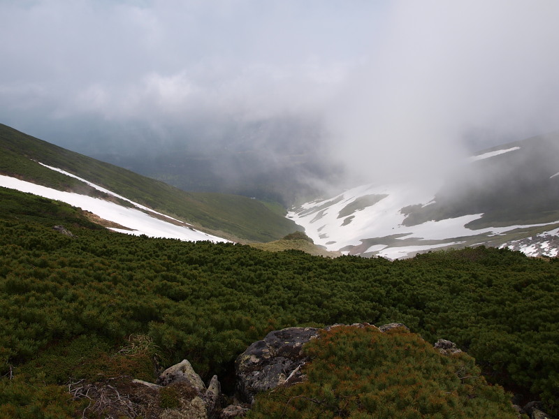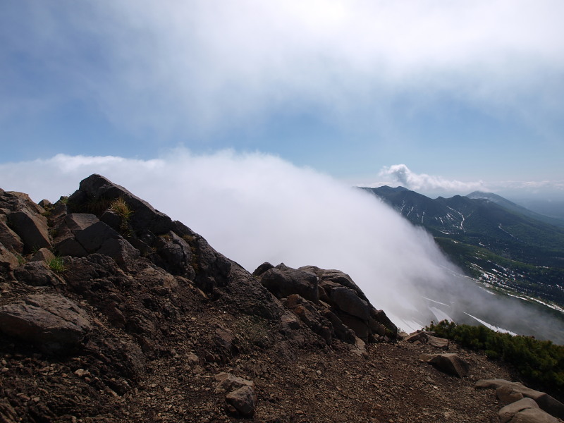 8:54 激しくガスが流れて下ホロカメットク山の方や原始ヶ原が見えました。