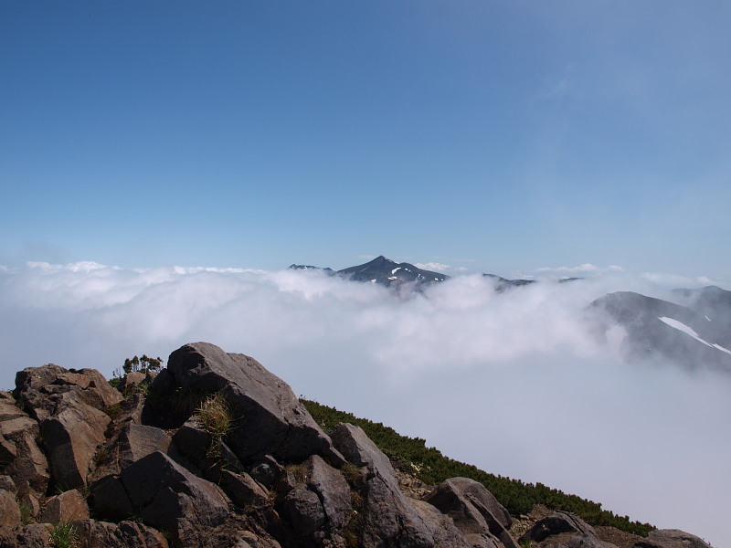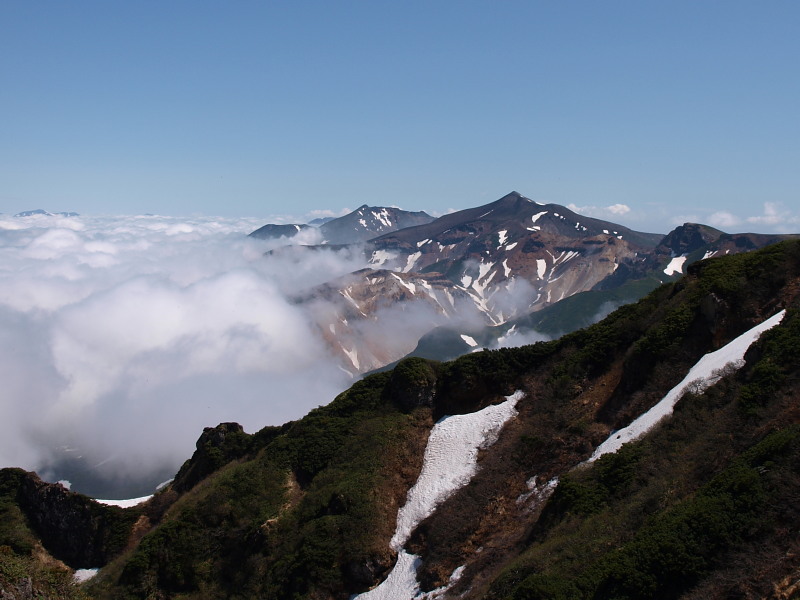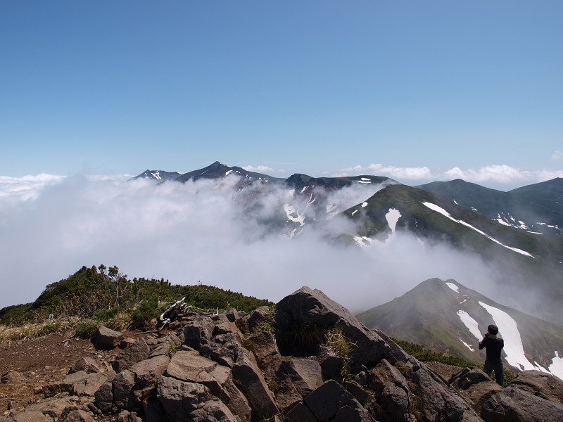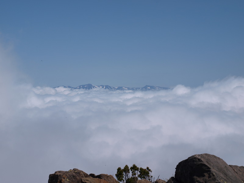 9:49 十勝岳。正面奥が美瑛岳。左の雲海に浮かぶ山は大雪山系。