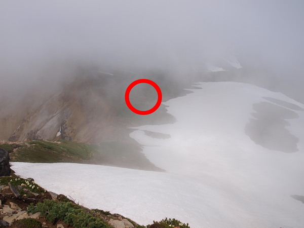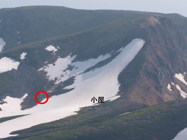 この日の水場は、小屋前の雪渓を渡った箇所。