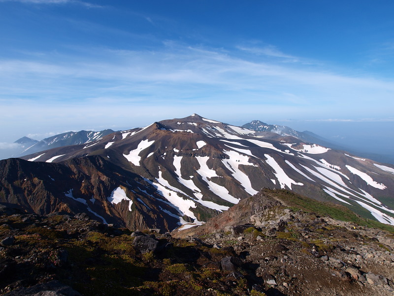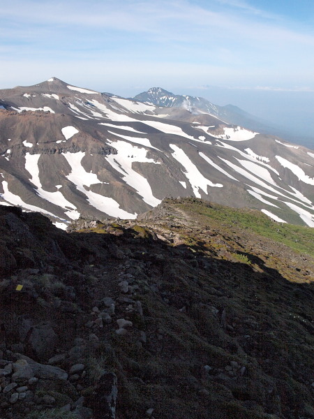 下ホロカメットク山から十勝岳。歩いた道も確認できます。