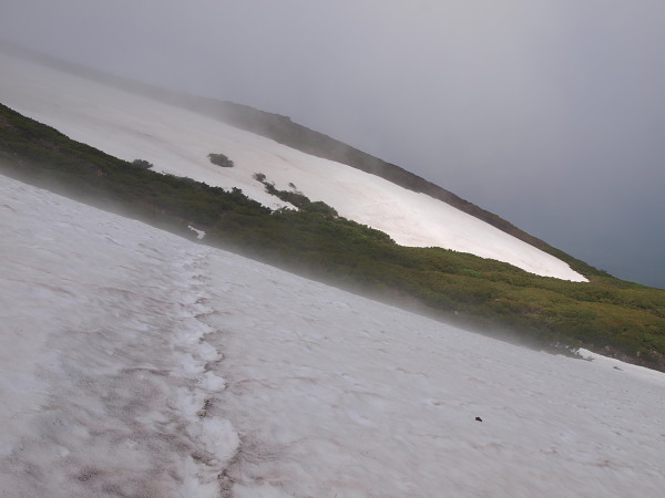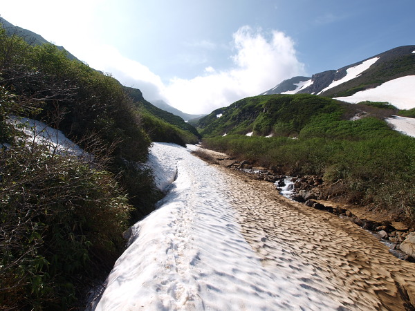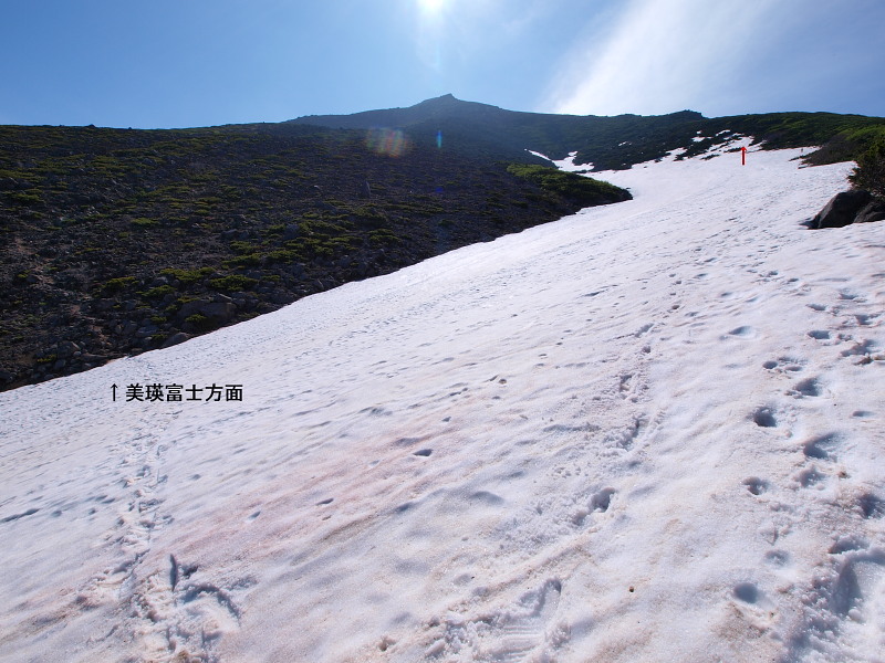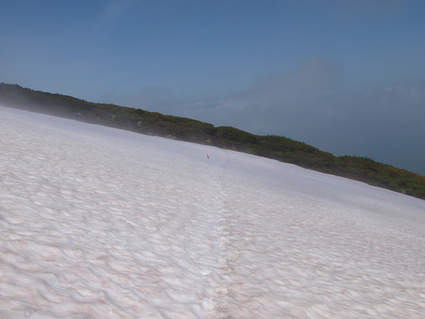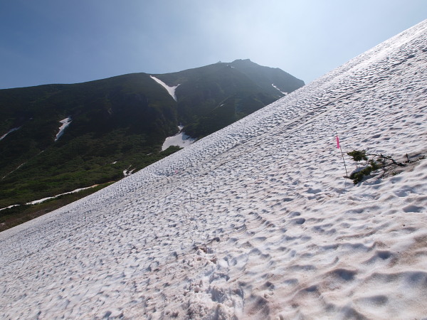 登りの時は雪渓を登り過ぎないよう注意が必要です。