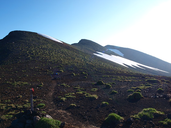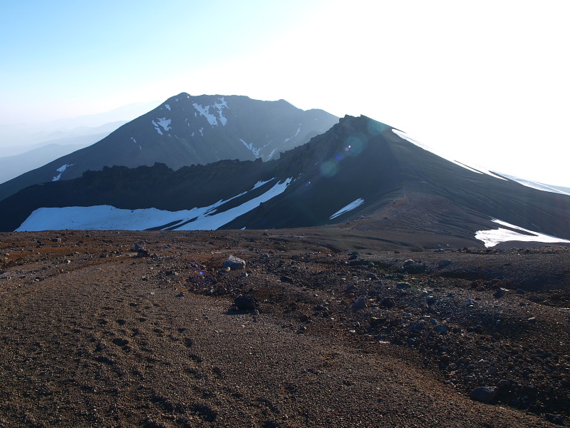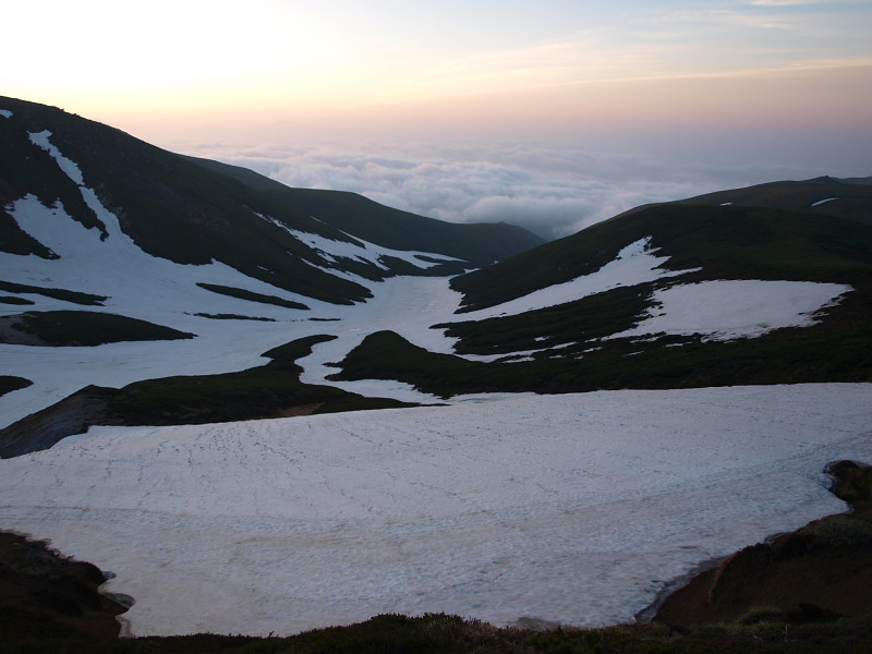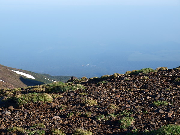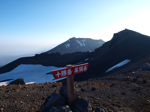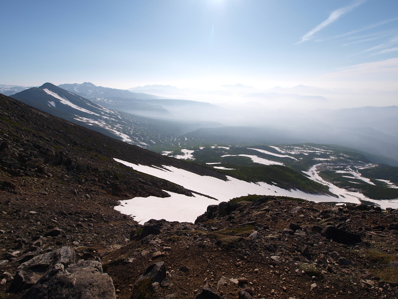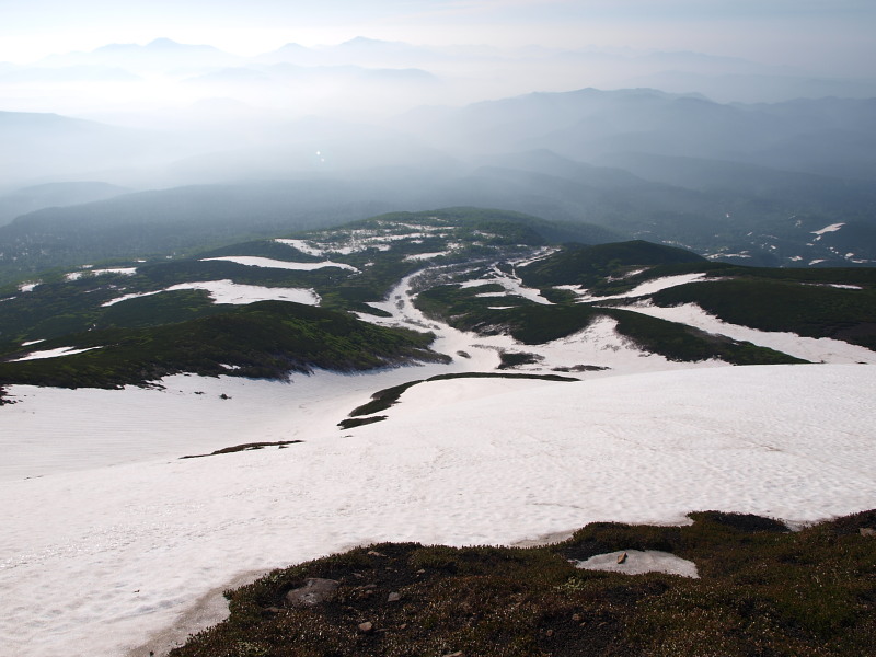 5:31 十勝岳と美瑛岳の最低コル。白金温泉が見えました。