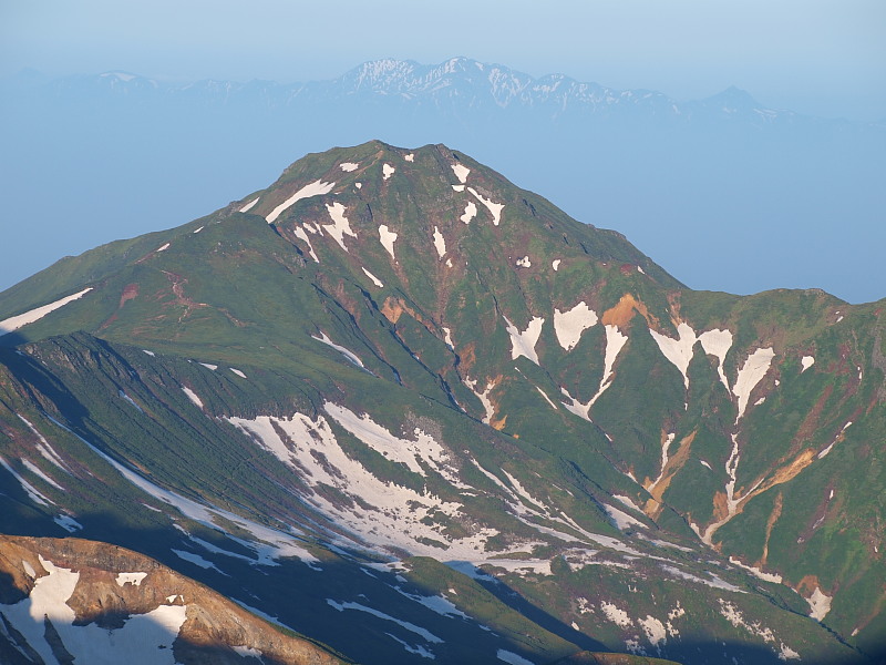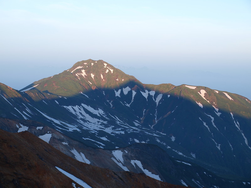 5:27 鋸岳。赤い矢印は上の写真の雪渓の矢印部分。