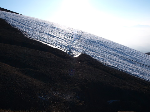 6:00〜13 小休止。 東側の斜面。谷筋にはたっぷりの雪。