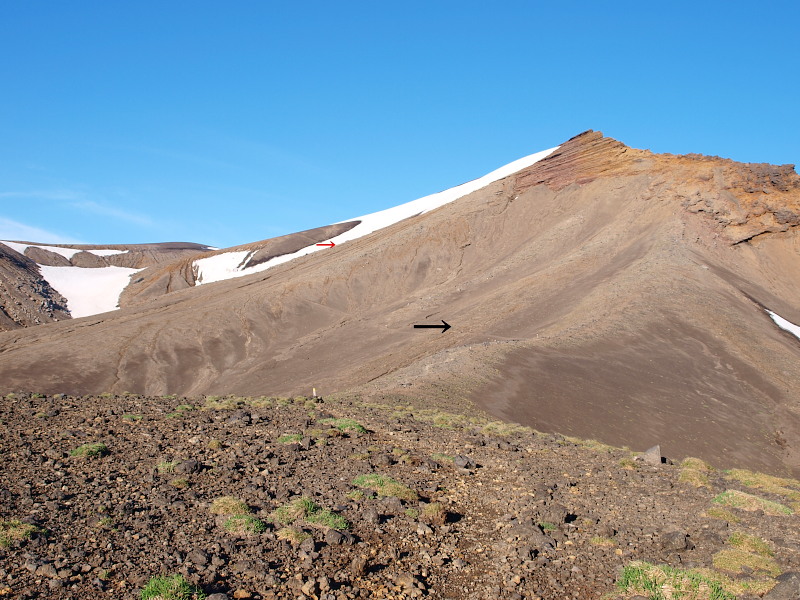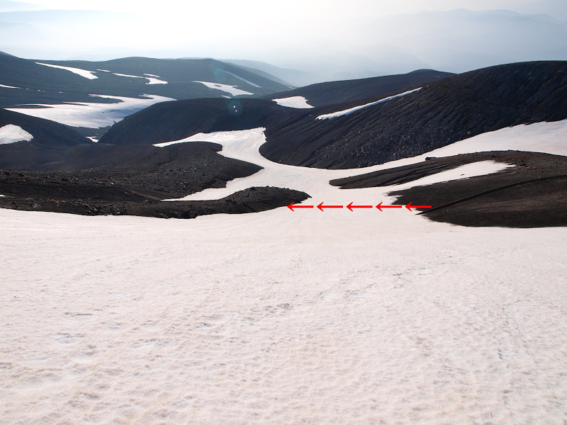 5:17 コースは雪渓手前からザレを一旦下へ。矢印の所で雪渓を渡ります。