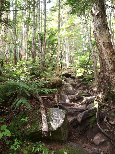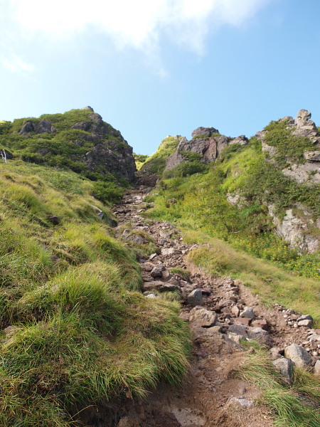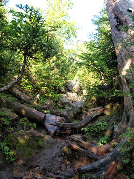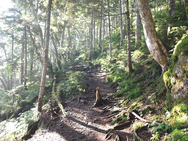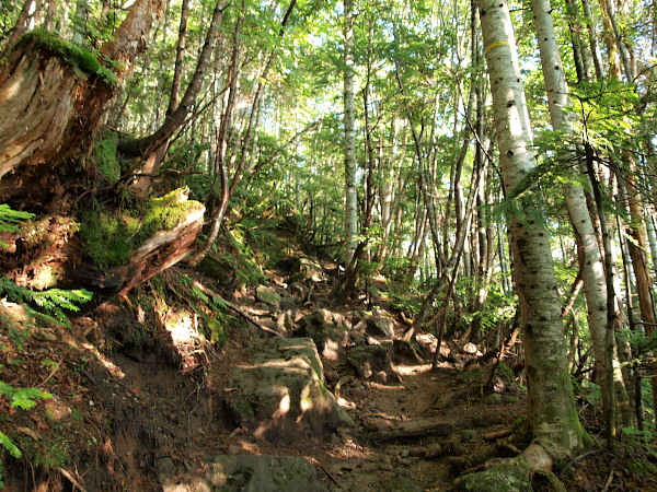避難小屋からは樹林帯の枯れ沢沿いの道です。