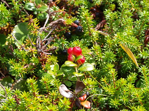 赤いのはコケモモの実かな?黒いのはガンコウランの実?。