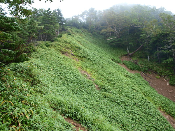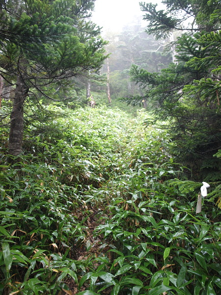 温泉平に向けて温泉ヶ岳をトラバースする笹道を進みます。