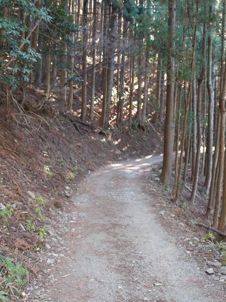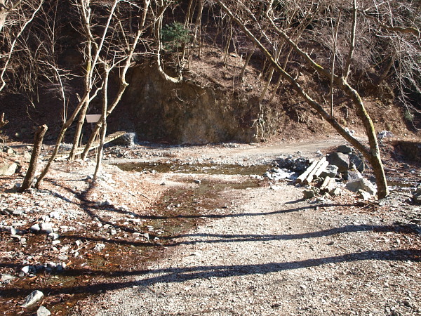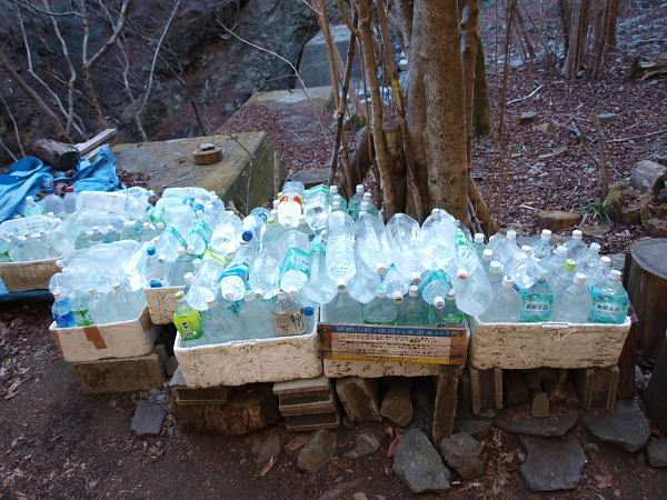 13:54 林道出合。ここに鍋割山荘の水があります。