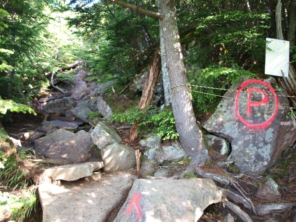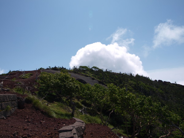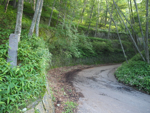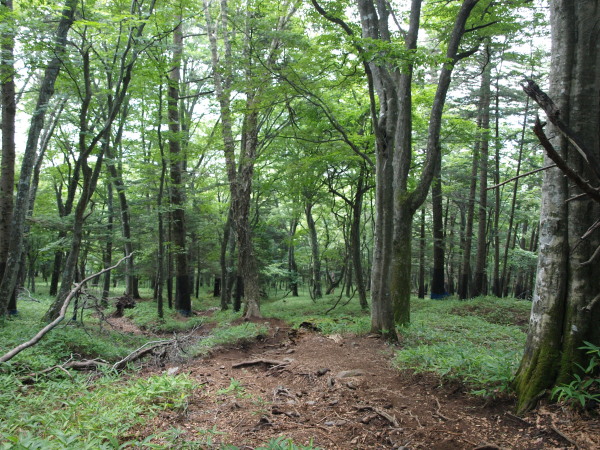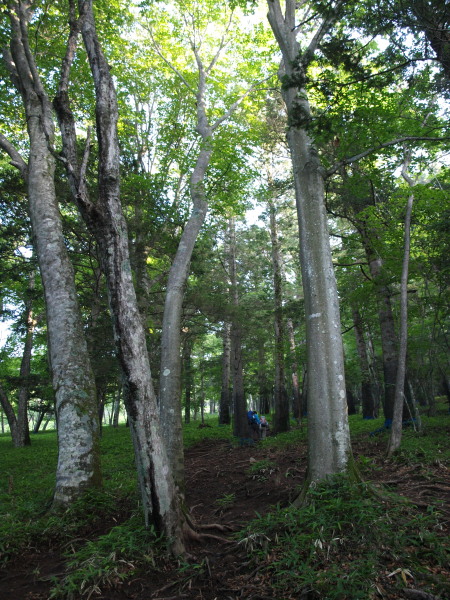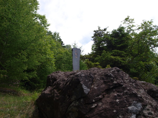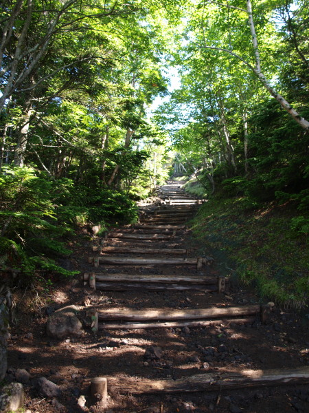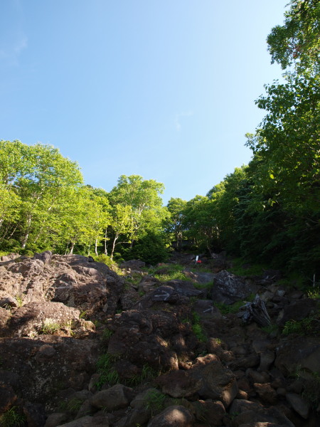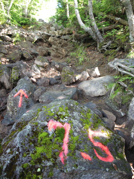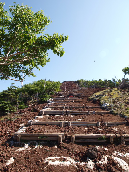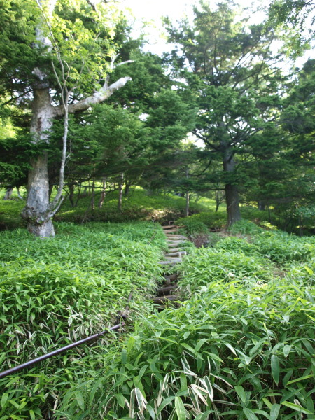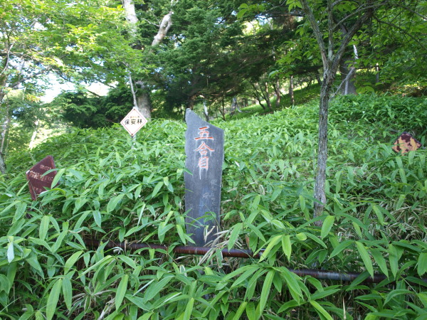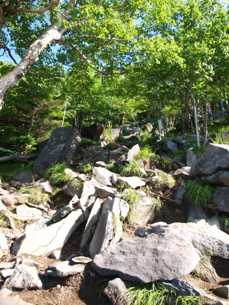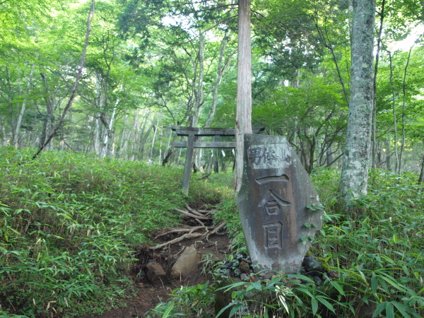 7:10 四合目。ここから再び山道へ。えぐれていて滑り易い道です。