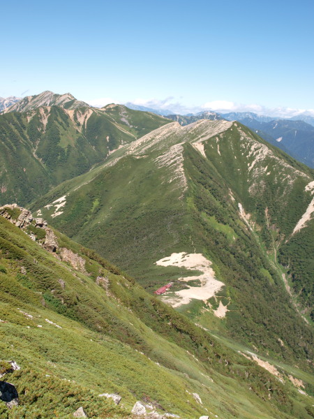 常念小屋が下に見えます。テン場は結構広いですよね。
