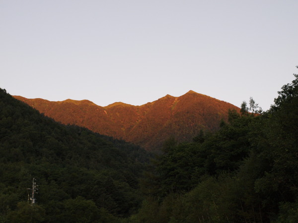 5:25 駐車場から朝焼けの蝶槍と稜線。