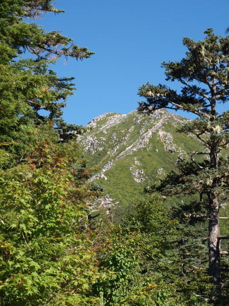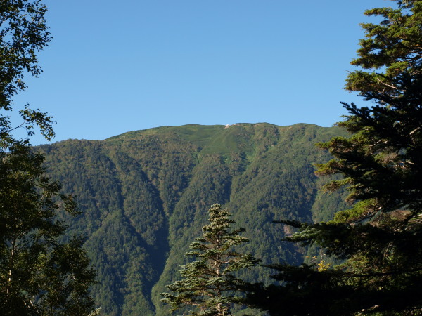 7:27 木々の間から蝶ヶ岳とヒュッテが見えます。