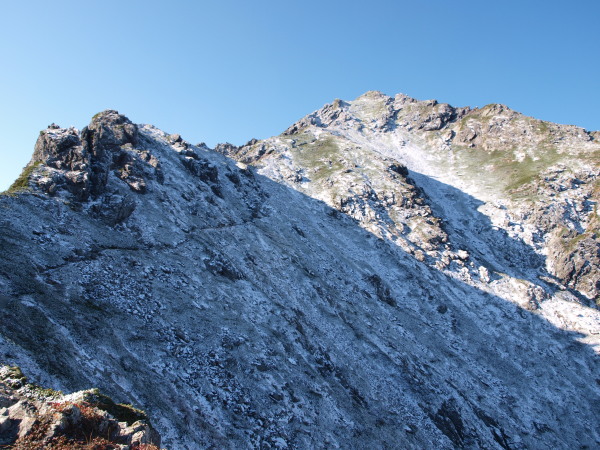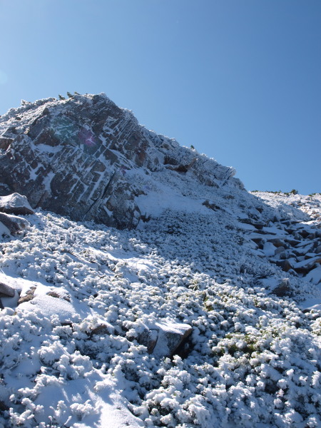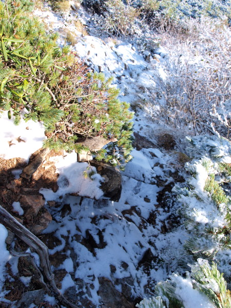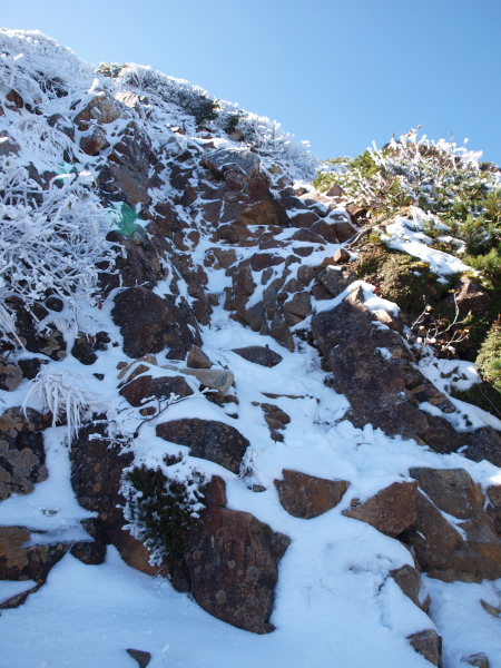 雪が無ければ楽勝なんですけど、微妙な雪は滑るし、浮石を隠して厄介でした。