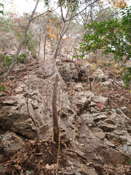 右側に堰堤を見ながら踏み跡をたどると岩にロープが垂れています。
