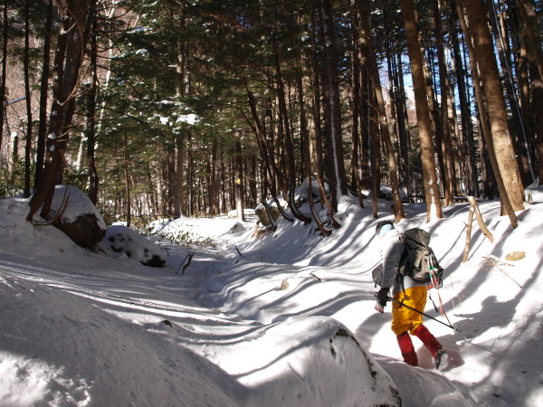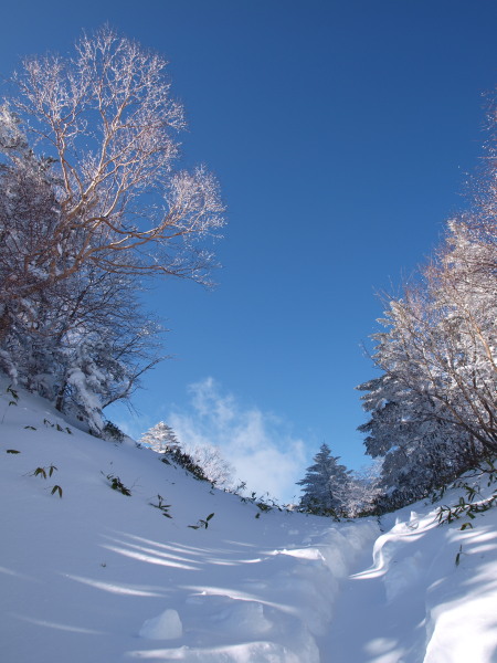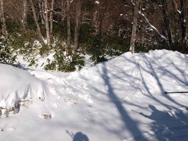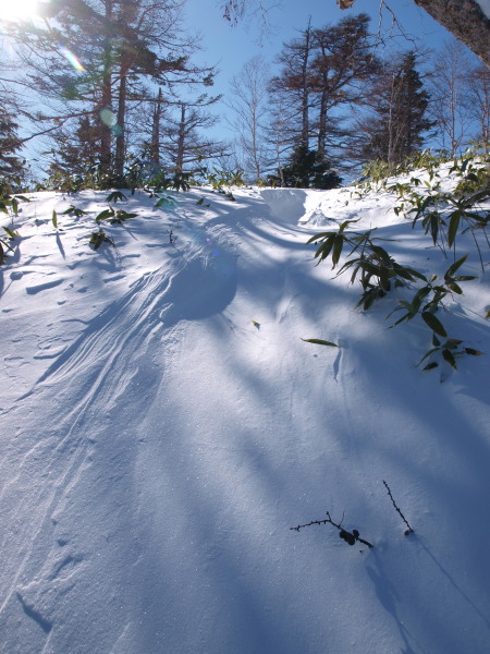 12:28 風の通り道はトレースが雪で埋まっていました。