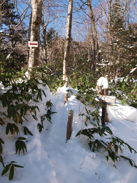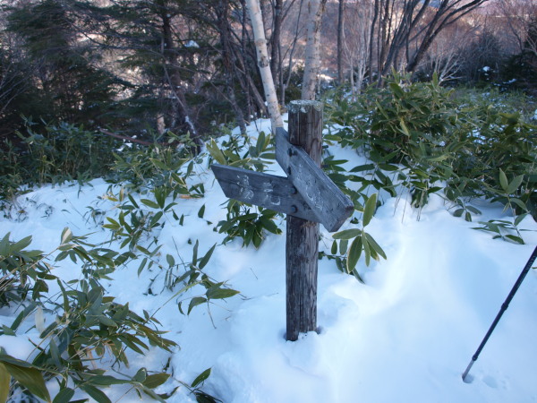 朽ちた登山ポストがあります。登山届けは湯元温泉で。