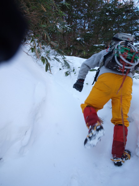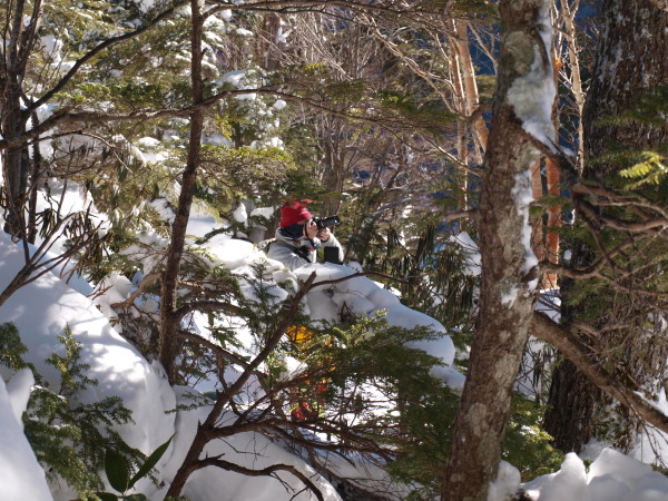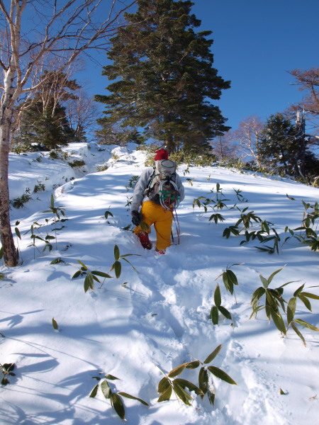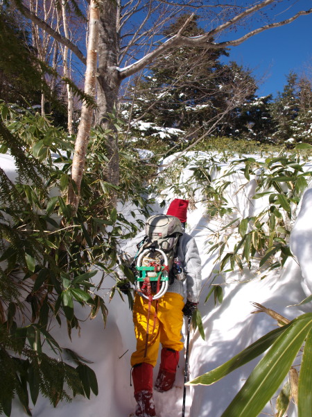一歩、笹原へ踏み出すと膝上まで雪に埋まります。