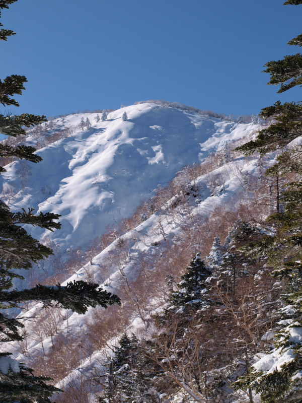 雪の浅い場所を少し下りましたが発見できずUターンしました。