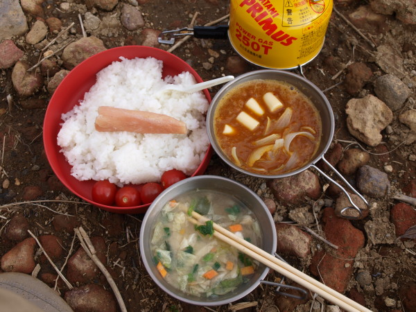 プレハブの小屋の中は日没まで蒸し暑く外で食事。