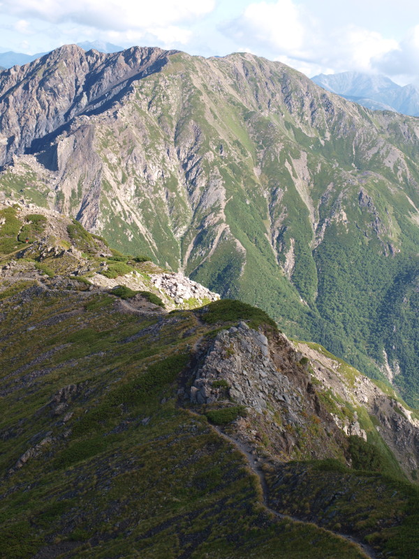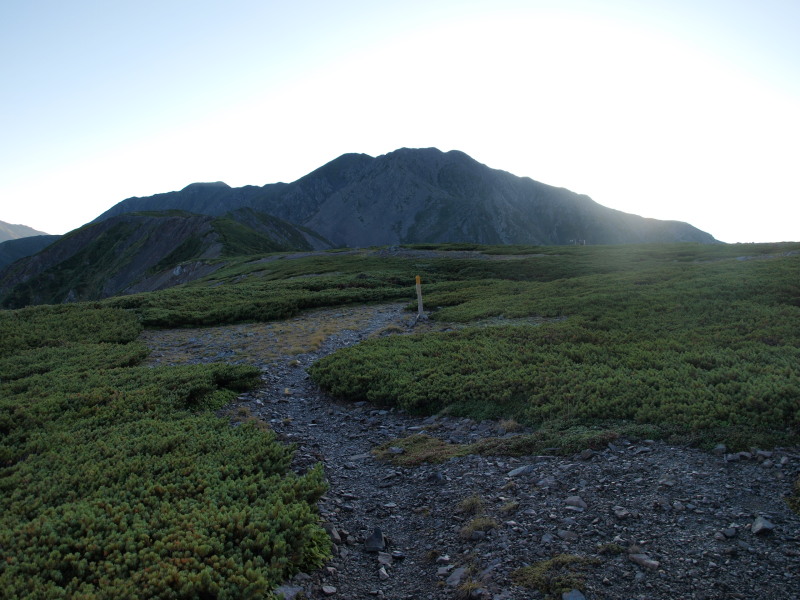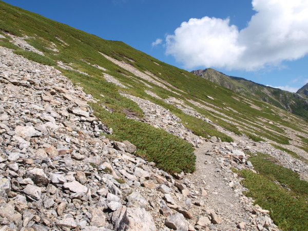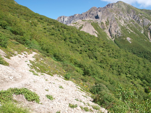 歩いている道は赤石岳の陰でまだ日陰です。