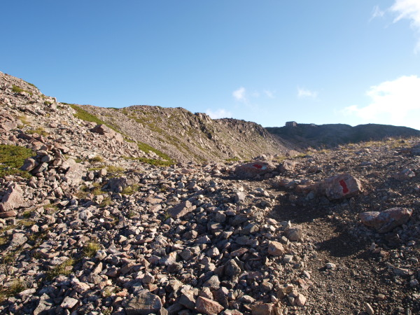 避難小屋へ立ち寄りたいけど先を急ぐので山頂へ。