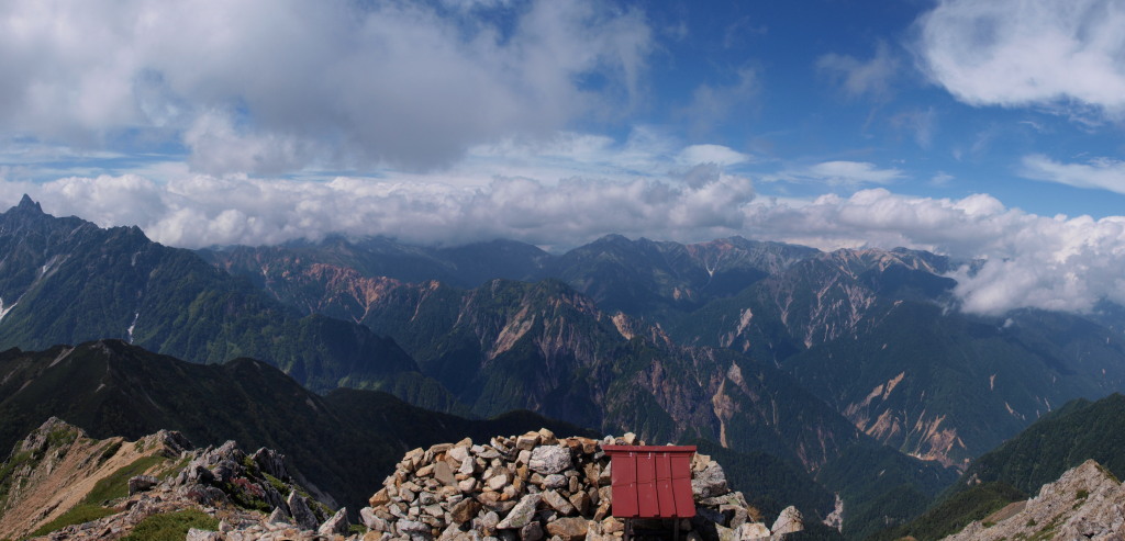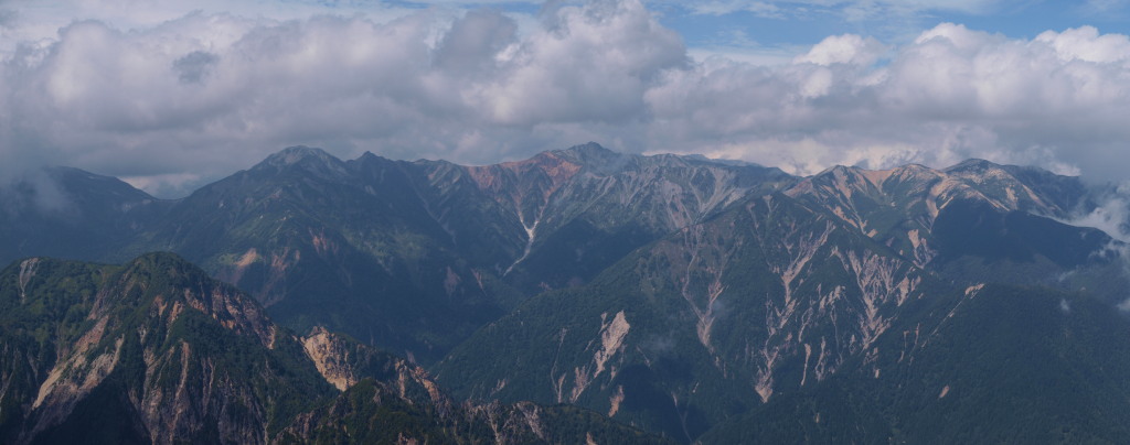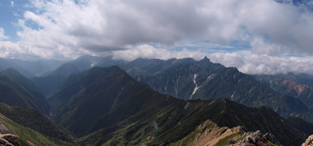 槍ヶ岳は晴れエリア。穂高岳は雲がかかっていて残念。