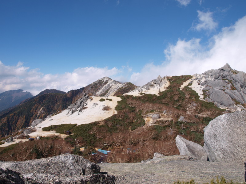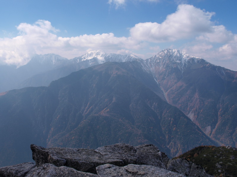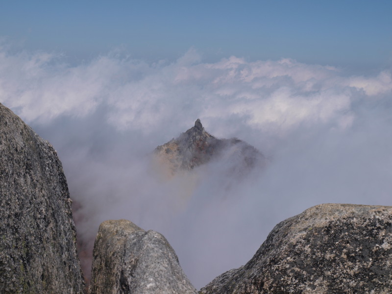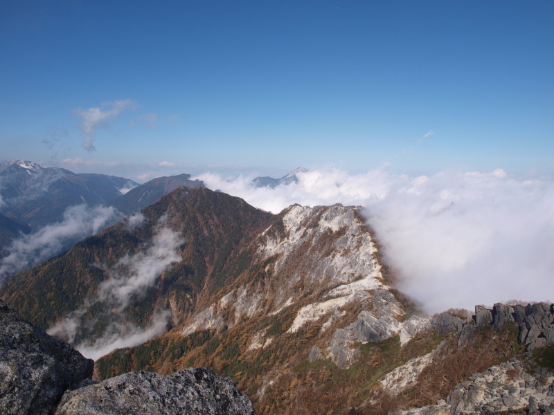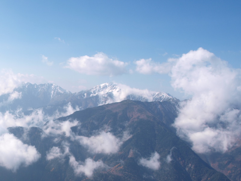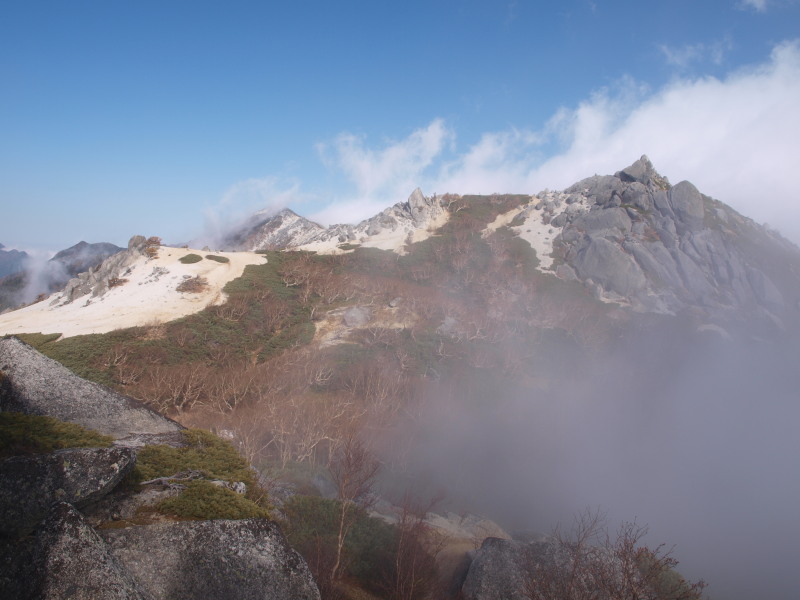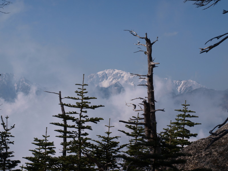 白峰三山。北岳は大樺沢から湧き上がる雲で見えません。