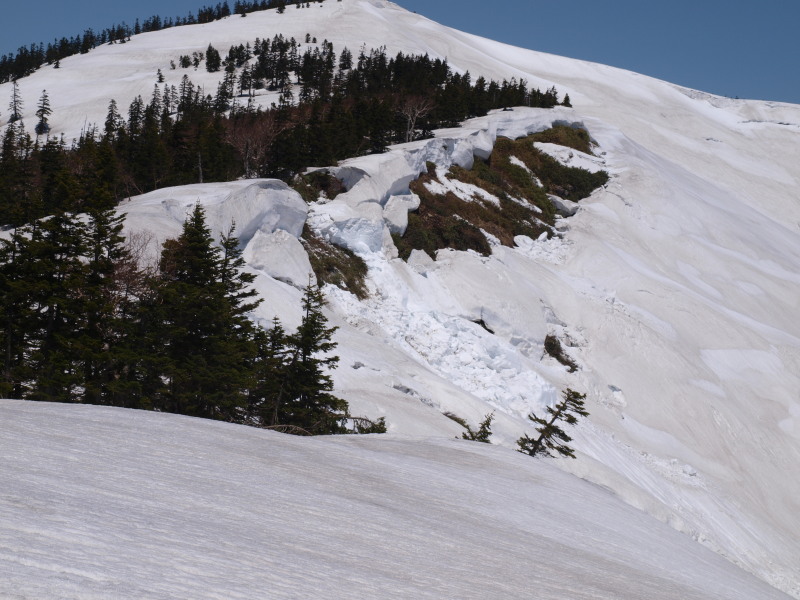 雪庇側は怖くて近づけないし、クラックも入っていましたから。
