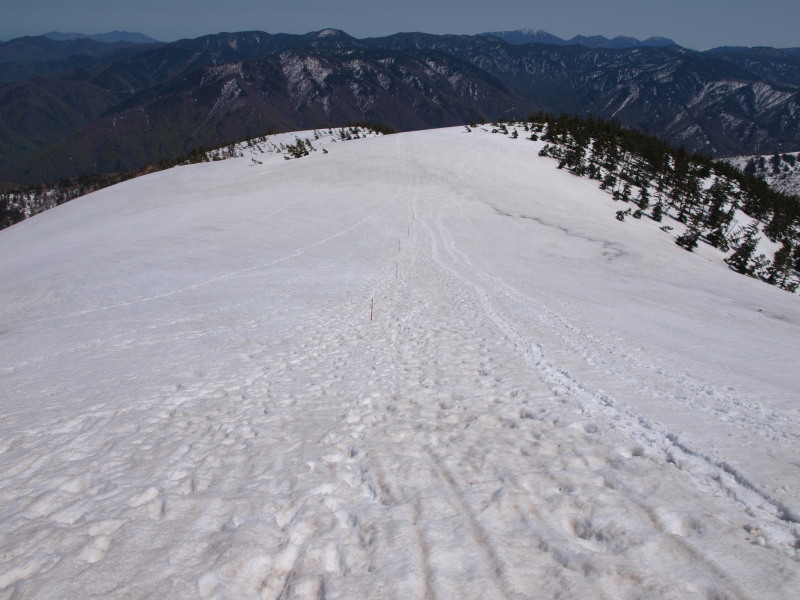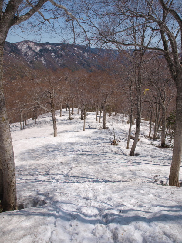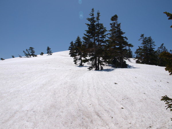 13:38 雪の量も少なくなり夏道がチラホラ出てきたらルートから外れてしまいました。
