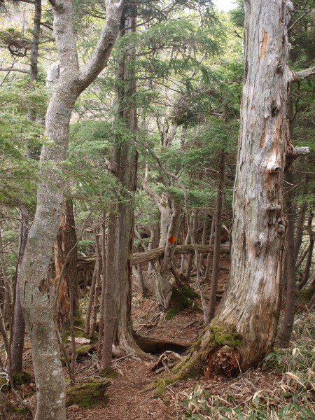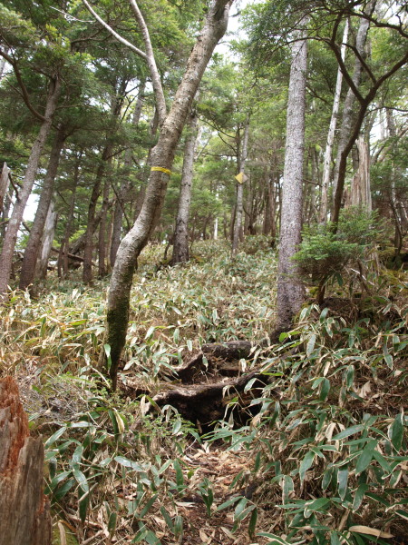 笹で踏み跡が不明瞭な場所はテープやリボンでルートを確認して進みましょう。