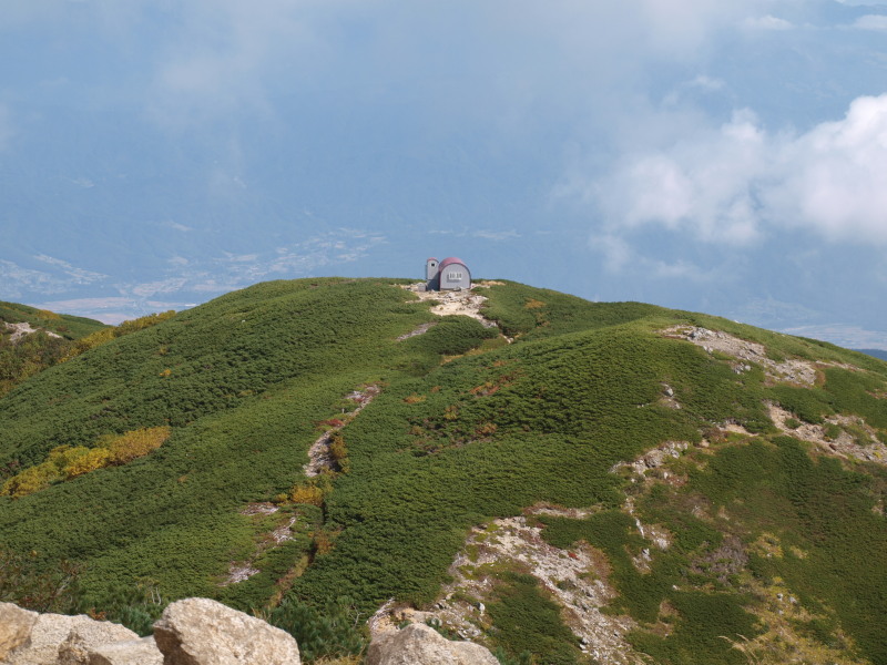 檜尾避難小屋。その先に檜尾尾根のルートが続いています。