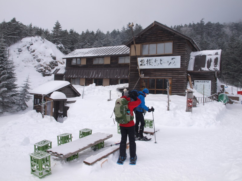 13:03 小屋の前でアイゼンからスノーシューに履き替えて下ります。