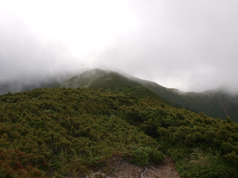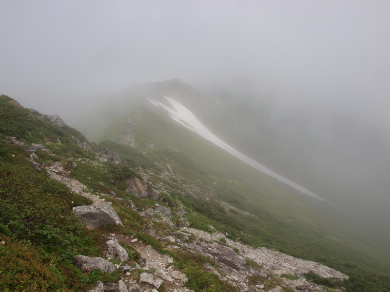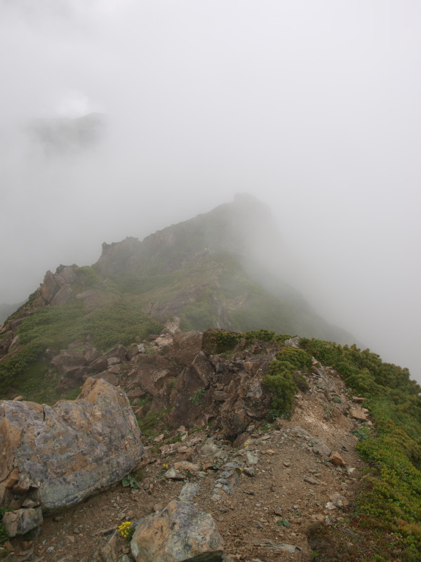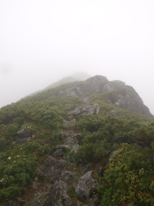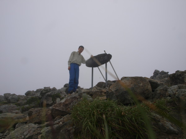 山頂に着いたらガスの中。そそくさと先を急ぎます。