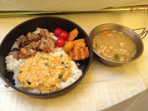 インスタントの親子丼とサンマの味噌煮とトマト。