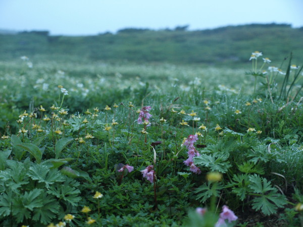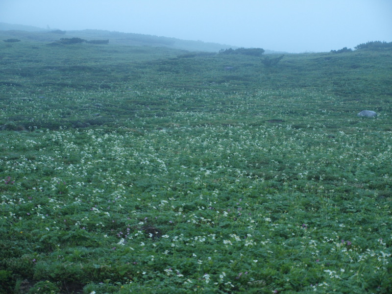 真夏なのにハクサンイチゲ、イワカガミ、アオノツガザクラ、チングルマなどが咲いていました。